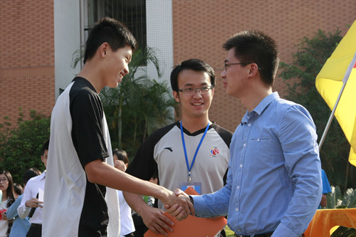 图为指导老师为班际篮球赛裁判长、副裁判长授牌