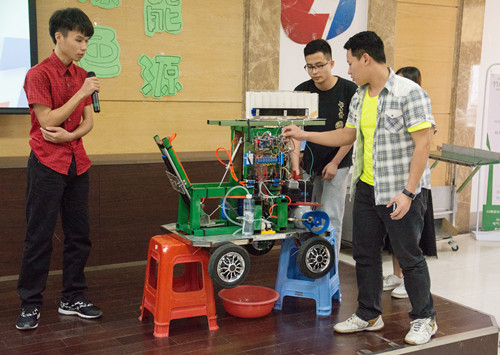 “The Burning Legion”团队的作品《城市绿化带美化助手》展示了他们设计的绿篱机;“岁月静好”团队则展示了不同于其他高耗能种植机的小型气动种植机,它以压缩空气为动力源,大大减少了能源的损耗,同时它小巧灵活的特性也为种植农作物带来不少便利;“家电也疯狂”团队向观众阐释了他们对于智能家居的理念,并重点解释了其中的低碳效应;“因缺斯汀队”解释了冷却塔温差发电的原理,抛出了其团队以小小的半导体解决电力问题的新颖设想;“动力无限”团队展示了智能水果加工设备。