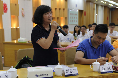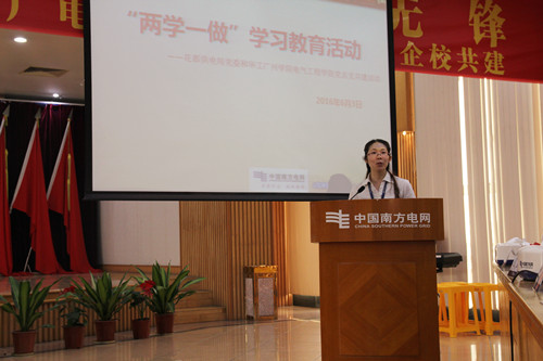 花都供电局与电气工程学院党总支分别进行就各自单位开展“两学一做”学习教育活动的详细安排做以介绍。花都局党群部主任许文浩,首先介绍了花都局服务区域的概况、电网设备情况、组织机构及人员现状和经营现状,随后她形象生动地介绍了花都局党委在开展“两学一做”的学习教育活动中的“四个一”工程,即开展“一周一学”、“一月一讲”、“一季一议”、“全年一评”。她提到花都局党委还为全体党员列出“责任清单”:局党委设置“书记日”,将书记与党员干部谈心谈话列入责任清单;也为各支部书记列出了做支部党员家访的清单;为全体党员开设“亮身份、亮承诺”专栏,要求全体党员在工作中展现党员素质,做出榜样形象。