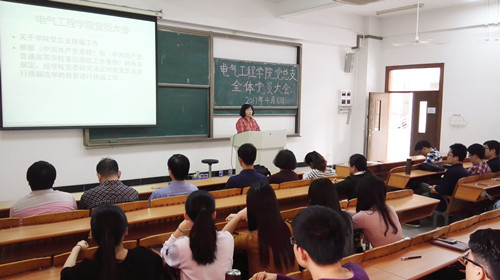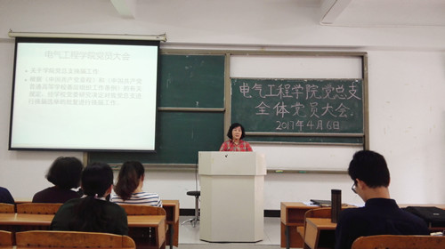 按照校党委的统一部署,为进一步落实好我院党总支换届选举工作,加强党建工作,4月6日中午于A5-206召开电气工程学院党总支全体党员大会。与会人员有我院党总支书记胡惠兰、副书记林斌、各党支部的教师党员及学生党员共63人。大会由副书记林斌同志主持。