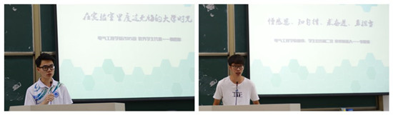 此后,由来自2015级电气3班的李世豪同学作为学生干部代表,分享了以《懂感恩、知自律、求奋进、勇担当》为主题的两年大学生活体验。随后是在暑假获得全国电子设计大赛广东赛区一等奖的林庭彬同学,分享了《在实验室里度过无悔大学时光》的感言,向与会同学揭开了实验室的神秘面纱,也阐述了兴趣伴随孤独,失败造就成功的科研之路。主持人伏莹老师说道,“他们两个人只是在座同学的缩影,他们走过的大学之路和今天所收获的成绩,皆因两个关键词——‘选择’和‘坚持’。 ”