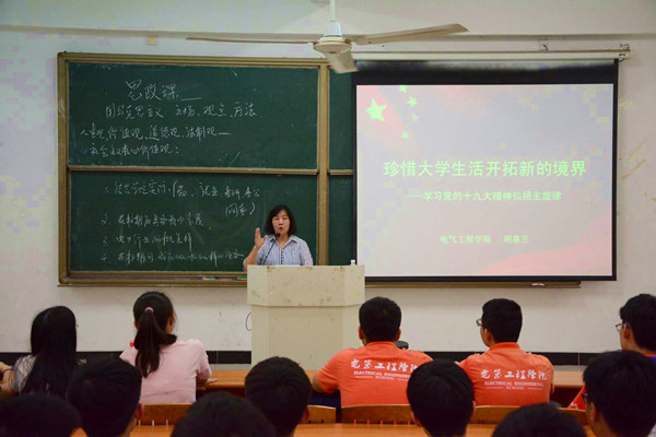 学习党的十九大精神,弘扬主旋律,4月12日下午,电气工程学院以“珍惜大学生活,开拓新的境界”为主题的2017级思政课堂于教学楼A5-201开讲。电气工程学院党总支书记胡惠兰担任本次课堂的主讲人,2017级300余名学生到场学习。