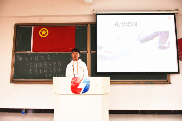 由六届一任公共关系部李镓炜为现场同学进行礼仪培训,培训内容重点包含不同场合的礼仪、正装穿戴等。