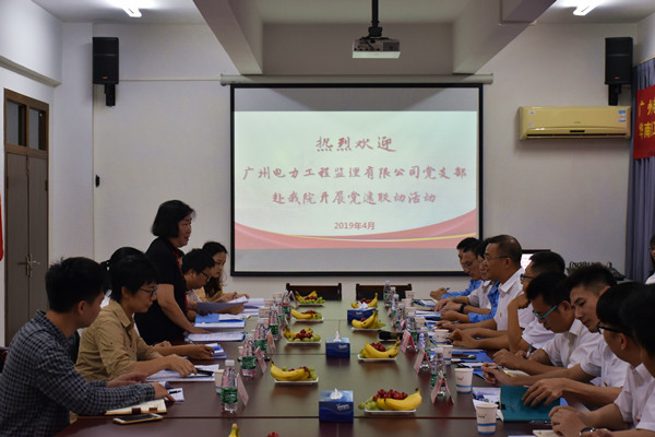 为探索党建工作如何更好地融入生产技术创新和应用型人才培养工作中,认真贯彻党的政治思想教育与劳动生产学习相结合,谋求共同联动得以理论联系实际的工作开展,将党建工作落实到实处,4月18日下午,广州电力工程监理有限公司党支部书记杜庆荣及党员等34人莅临我校电气工程学院开展“校企联动 共育英才”主题党日活动,电气工程学院党总支书记胡惠兰及师生党员代表等25人参加了本次活动。会议由胡惠兰主持。