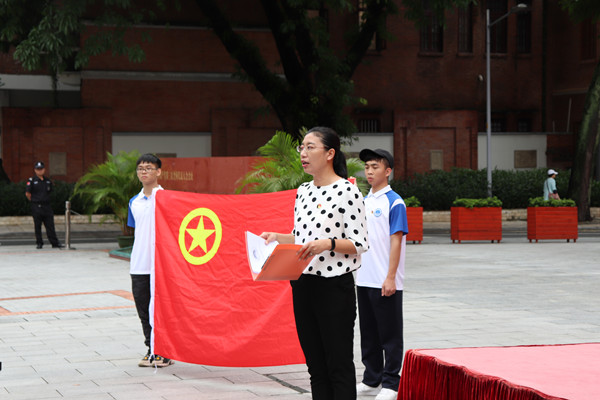 在老师的带领下,同学们准时抵达中共三大会址现场集合整队,进行合照。随后,全体与会人员面向团旗奏唱团歌。并以直播形式记录全程,让更多的同学一起学习,弘扬五四精神。