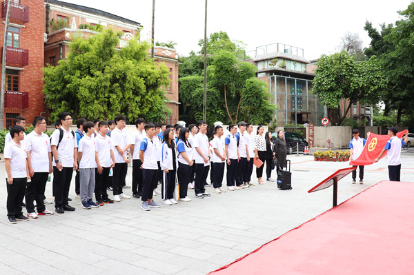 在老师的带领下,同学们准时抵达中共三大会址现场集合整队,进行合照。随后,全体与会人员面向团旗奏唱团歌。并以直播形式记录全程,让更多的同学一起学习,弘扬五四精神。