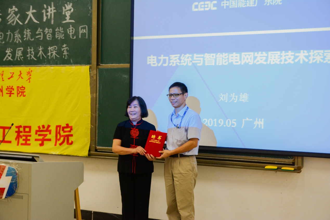 为了学习贯彻习总书记在纪念五四运动一百周年大会的重要讲话精神,弘扬青年五四精神,培养专业实践人才,增强学生对电气专业的认识。5月22日下午,电气工程学院2019年电力专家大讲堂“电力系统与智能电网发展技术探索”于A5-101举行。出席本次讲堂的嘉宾有:中国能源建设集团广东省电力设计研究院有限公司广东天联电力设计有限公司总工程师刘为雄教授、电气工程学院副院长胡惠兰、郭培虹,学院部分教师以及17级全体学生等。
