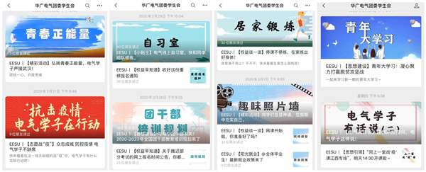 疫情发生以来,为了让学生全面掌握疫情信息,辅导员充分利用QQ、微信公众号等平台传播疫情防控知识,引导学生通过学习防控知识增强自我的调节能力。在各年级辅导员统一指导下17、18、19三个年级累计发布疫情防控推文61篇,向校团委官方公众号投稿包含海报、书法和视频在内的11项抗疫作品,同时电气工程学院团学公众号发布疫情防控宣传知识推文10篇,在“电气青年说”、“权益谈一谈”等多个栏目发布疫情的最新政策以及电气青年疫情期间的生活状况。2019级辅导员王凡积极组织19级同学创作书法、绘画和视频等充满正能量的作品,为武汉加油,为中国加油,并倡导同学们要正确面对困难,坚定战疫必胜信心。2017级辅导员宋海圆通过关注社交平台的学生动态,了解学生的生活和思想情况,对于网络上出现的谣言以及政府的通知会第一时间收集最权威的信息传递给学生,防止学生盲目听从一切不真实的信息。