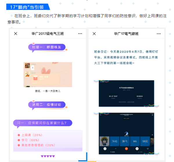4月15日至4月22日,电气工程学院各年级辅导员分别针对年级特点开展线上“云”班会活动。班会上,各年级分别就学风建设、班级计划、疫情防控、就业创业等方面进行了讨论和分享。2018级辅导员刘博洋在班会上向同学们强调疫情期间线上课程不能够有丝毫松懈,要认真完成每一次线上签到任务,保证课后作业能够及时完成。2016级辅导员林斌在班会上强调,今年就业形势较为特殊,希望同学们能够利用好线上招聘资源积极就业,学院也会尽最大能力满足毕业生各项需求,为毕业生的毕业和就业工作保驾护航。