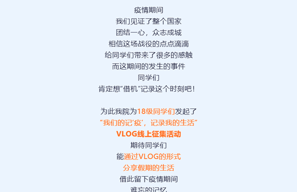 为了更好的丰富同学们的课余活动,记录同学们在疫情期间的生活。4月14日学院举办了“Vlog短视频征集大赛”活动。通过3至5分钟的短视频方式来记录自己的日常生活,为疫情期间留下难忘的记忆。2018级同学姚颖林分享到:“爸妈知道我要拍摄Vlog非常的配合我,平时在学校时间比较长,这次难得在家这么久并以短视频的方式记录疫情期间自己的生活,不仅意义非凡也加深了我与父母间的感情”。