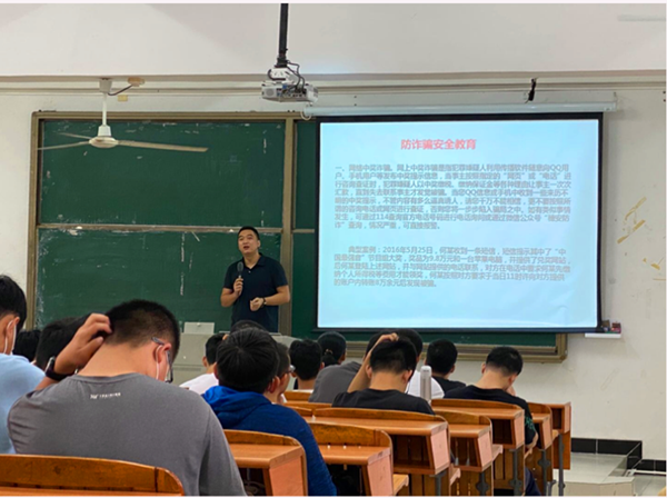 最后,林斌分别从三个方面对新生进行了安全教育。第一,他从人身安全、财产安全、消防安全、生活安全和交通安全五方面给同学们进行举例示范,并向同学们强调应该注意的事项,让同学们对生活中常见的安全问题有了更深刻的了解。第二,他以高校宿舍起火等真实案例案例出发,向同学们播放了系列视频为新生敲响警钟,并且他向新生们介绍了窃贼偷盗的惯用伎俩,希望新生们注意宿舍防盗,时刻保持警惕,不轻易同意陌生人随意进出房间等安全建议。第三,他根据以往大学生被诈骗情况的数据来警示同学们要增强安全与自我防范意识,尤其是目前网络诈骗较多,一定要留意网络上的各自信息,不轻信他人。
