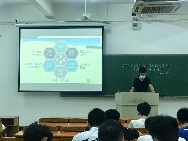 2019级电气五班班长在讲解了基本的诈骗案例和诈骗手法之后,向同学们分享了十九大报告学习中:有效维护国家安全主要有哪些要求?他向同学们分享到,习总书记在十九大报告中指出,国家安全是安邦定国的重要基石,维护国家安全是全国各族人民根本利益所在。我们作为大学生要从自己力所能及的事情做起,坚定捍卫国家利益,保护国家安全。