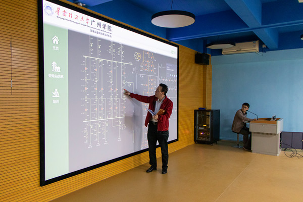 随后,在沈娜的陪同下,邱智强一行参观了我院新建成的电力虚拟仿真实验室,该院高级工程师刘彬博介绍了该实验室的概况,并演示了750kV变电站虚拟仿真培训系统巡视检查、倒闸操作和模拟故障处理操作。虚拟电力设计院研发团队的同学们用VR/AR专用设备展示了近年来开发的系列获奖成果,主要包括电力设备的拆解和结构分析、变电站拓扑结构仿真系统、基于VR技术和AR技术的变电站(配电房)巡检系统等。邱智强仔细认真的观看了我院750kV变电站虚拟仿真培训系统操作演示,并提出了许多的宝贵意见,促使该院电力虚拟仿真实验室的仿真培训更加贴近南方电网公司实际运作。