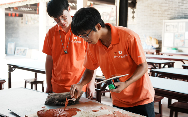 为了让大家更直观感受灰塑的艺术,邵成村带领团队成员现场制作灰塑。灰塑制作工艺考究,从构图、打钉扎骨架,再到草根灰打底、纸筋灰塑形,最后上色灰、上彩,他现场一步一步为大家演示。在他的指导下,团队的成员们成功进行了灰塑制作的初次尝试。邵成村说道,“作为一名学生,不仅要学习理论,还要自己动手,发现问题、解决问题,才能印象深刻。”从最开始的无从下手,到后面的逐渐熟练,团队成员在实践中真切感受到了这门古老技术的魅力。