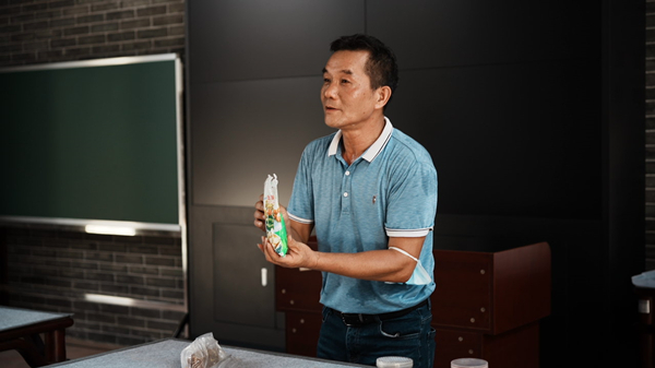 邵成村为团队成员介绍灰塑原材料(郭梓康 摄)