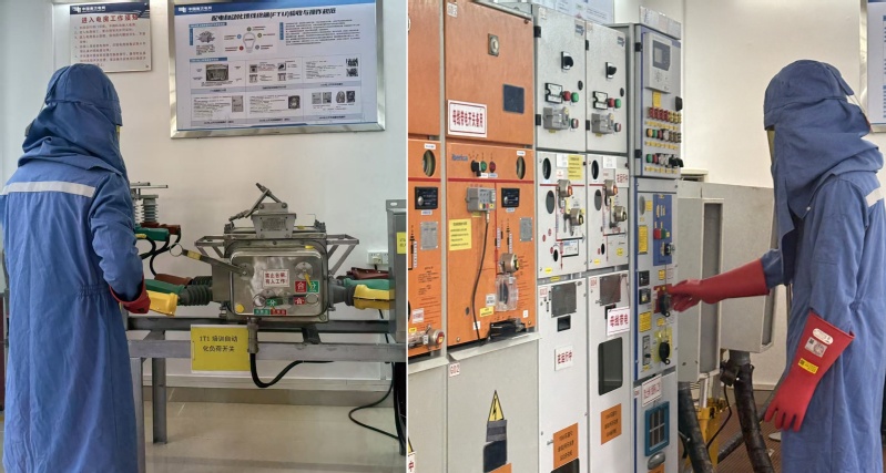 在模拟演练环节,学生身着防护服,完成“模拟带电环境下设备状态检查-操作指令确认-倒闸操作执行-应急故障排查”全流程演练,同步记录操作难点与应急处置方法,并现场拍摄设备测试图片,进一步丰富了研究与训练素材,也有效促进了理论知识与实践应用的深度融合。