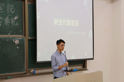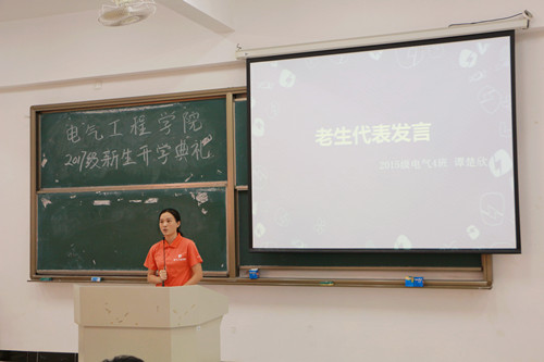 接着,2015级电气4班谭楚欣作为老生代表发言,她对新生们加入电气工程学院这个温暖的大家庭表示欢迎。她说,大学生活充满着自由,同时也有很多的机遇和挑战。大学是全新的起点,是全新的开始,不管是在学习还是在社团、组织的舞台中,新生们都可以抓住每一次能展现自己的机会,积极参加各种活动。最后,她希望大家能够清楚自己想要什么,想成为怎样的人,活在当下,成为一个更好的独一无二的自己,这才是青春努力的意义。、