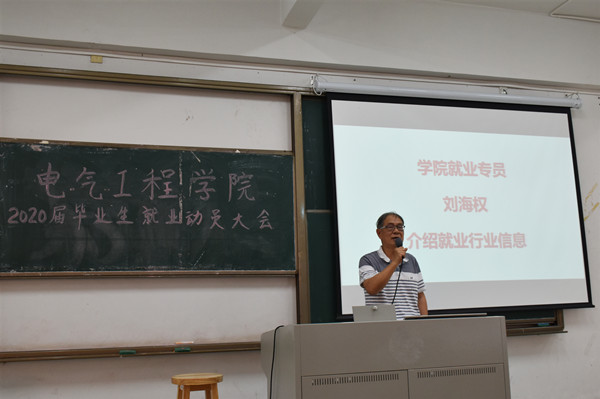 为做好毕业生爱国主义教育,树立正确的就业观,确保2016级学生顺利毕业,让2020届毕业生了解当前就业形势与政策, 10月10日下午,电气工程学院2020届毕业生就业动员大会于教学楼A5-201召开。出席大会的有电气工程学院副院长郭培虹,学校工作处就业指导中心主任梁伟滔,学院就业专员刘海权,2020届毕业生辅导员林斌,年级教务员林泽梅,各班班主任以及全体毕业生。林斌主持本次动员会。