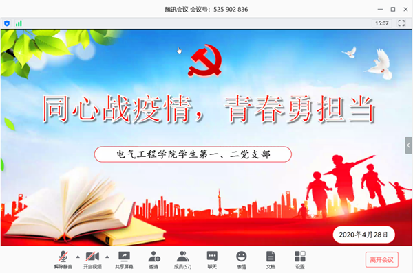 为积极贯彻落实“开学不返校,组织生活不停顿”精神,创新组织生活新形式。电气工程学院学生党支部于4月28日晚依托腾讯会议网络平台开展了“同心战疫情,青春勇担当”主题线上党日活动,电气工程学院副院长郭培虹,全体辅导员以及学生第一、第二党支部学生党员们参与了本次活动,会议由宋海圆主持。