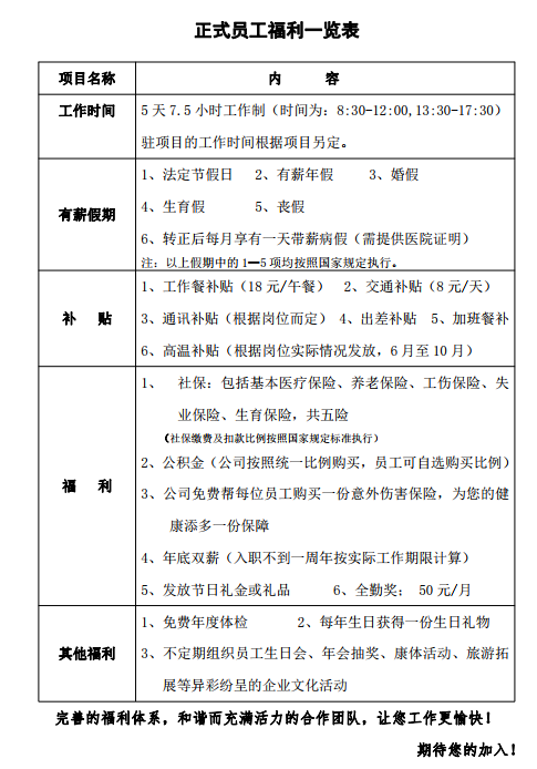 2.带薪假期: 享受国家法定节假日、 婚假、 产假(陪)、 病假、 年假等;