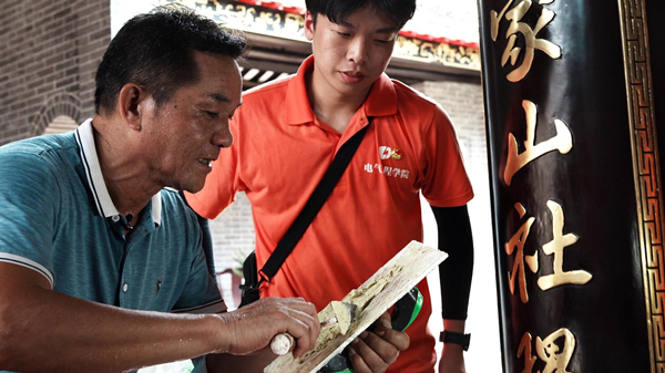 7月9日下午,实践团前往了仲和徐公祠和资政大夫祠,访谈国家级非物质文化遗产灰塑代表性传承人邵成村老师。邵老师在仲和徐公祠为实践团示范了灰塑的制作流程,包括构图、打钉、扎骨架、草筋灰打底、纸筋灰塑形、上色灰,上彩。观看过后,在邵老师的指导下,团队的每一个人都来体验制作灰塑的过程。流程看似简单,实则每一步都蕴含着技巧与经验。在资政大夫祠内,邵老师利用资政大夫祠保存下来的墙体,为大家现场展示了岭南古建筑的工艺,并阐述了其中的原理和文化意蕴。他指出,灰塑的学习时间比较长,作为灰塑传承人必须要低调学习,不断地努力,不断地探索。在谈及灰塑的传承时,他表示:“希望有更多人了解灰塑文化,领略中国的传统文化,在中国几千年沉淀积累下来的经验和技术中,去探索更多蕴含在古老技术文化中的价值和中国智慧,并将其传承下去。”