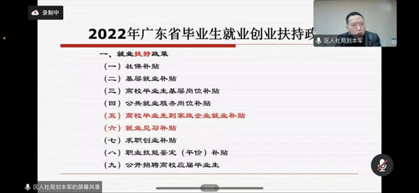 随后,他从广东省就业创业政策的出台背景、政策体系、扶持政策、创业政策、补贴政策等方面深入浅出地作了系统地解读,阐述了十二项就业扶持政策的相关内容,涵盖社保补贴、基层就业补贴、高校毕业生基层岗位补贴、应征入伍、‘三支一扶’基层就业等内容。并结合多个案例分析,阐述了六项创业扶持政策的相关内容,涵盖创业培训补贴、一次性创业资助、创业租金补贴、创业带动就业补贴等内容。最后,他还对同学们关于就业创业政策的问题给予了解答,提升了学生就业创业政策的知晓度。