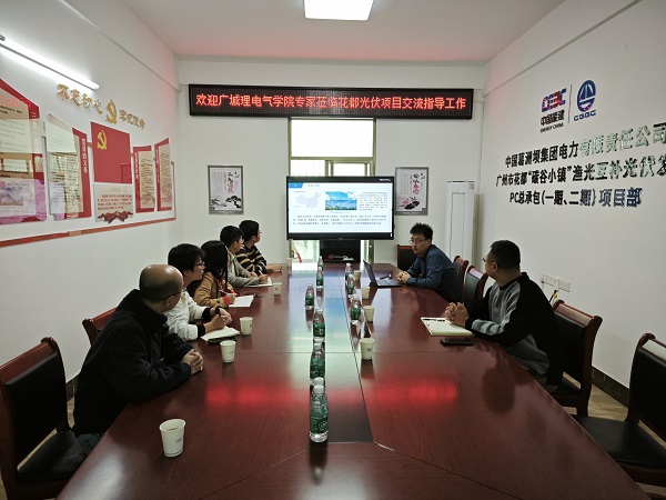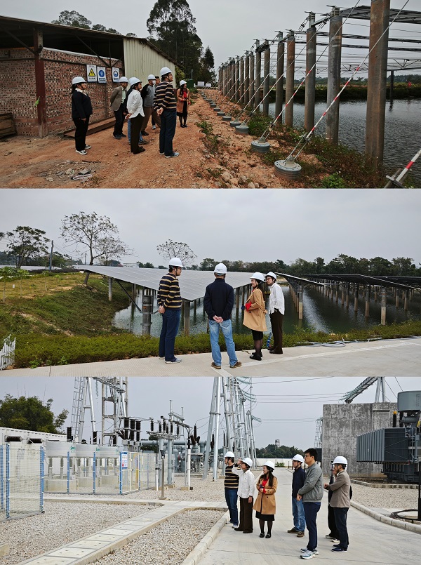 为响应国家“碳达峰、碳中和”政策方针,贯彻落实以高等教育高质量发展服务国家碳达峰碳中和专业人才培养需求。12月1日上午,电气工程学院党总支副书记符红勋、副院长沈娜等一行前往广州市花都赤坭“碳谷小镇”在建渔光互补光伏发电项目进行校企交流。中国华能集团有限公司(以下简称“中国华能”)广州花都区启帆新能源有限责任公司项目部项目经理孙传庆、副经理刘潮,中国能建中国葛洲坝集团电力有限责任公司(以下简称“葛洲坝集团”)花都光伏项目部总工程师邓杰,广东电网能源发展有限公司(以下简称“广能发”)花都光伏输变电项目部项目经理陈锐峰出席交流会。