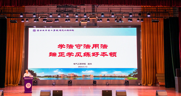 5月13日下午,电气工程学院在学生活动中心开展院长思政第一课。学院院长赵杰以“学法守法用法,端正学风练好本领”为主题授课。党总支副书记符红勋、学院各专业教研室负责人、教师代表、辅导员及学院全体学生参加思政课。