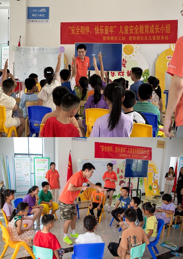 7月8日,实践团通过定点宣传与摆摊、流动发放宣传海报和手册、播放宣讲课堂视频等形式,为望埠镇居民普及安全知识。在随后的几天里,实践团前往望埠镇儿童快乐家园开展安全知识教育活动,以小游戏、互动问答、教唱歌曲的方式为望埠镇的小学生们开展了三次安全知识学习课堂。
