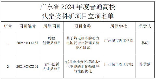 此次获批的项目中,林涛副教授主持的《基于热电制冷的动力电池复合热管理关键技术研究》获广东省普通高校特色创新类项目立项;陈承戴博士主持的《燃料电池分区流场水-气重整的水传输机理与性能优化》获广东省普通高校青年创新人才类项目立项。