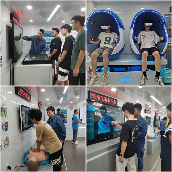 此次活动邀请南电技术公司作为专业指导,以“安全用电”为核心,将“安全体验培训车”引入校园,为师生开展为期4天的用电安全体验活动。车内设有“虚拟灭火体验区”“AED心肺复苏体验区”“AR安全隐患排查体验区”“VR高空坠落体验区”等多个项目体验区,利用虚拟现实技术,对生活中的火灾案例、工程安全案例进行还原,让师生身临其境。