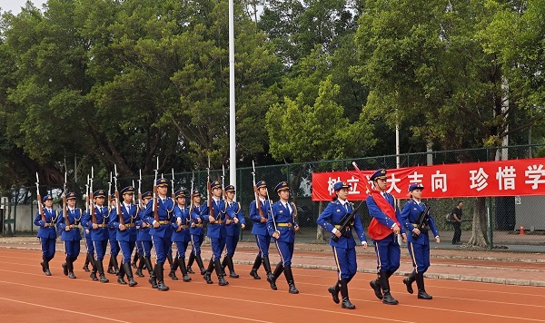 升旗仪式开始,国旗护卫队成员迈着坚定的步伐齐步走向升旗台。随着国歌响起,五星红旗在全体师生的注目下缓缓升起。