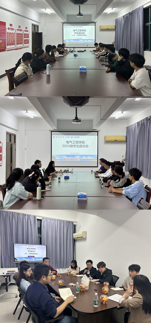 为进一步了解学生在学习上的困难与问题,广泛听取学生的意见和建议,优化教育教学方式与人才培养方案,12月3日至5日,电气工程学院在B6-403、407分别召开学院各年级各专业共三场学生代表座谈会。电气工程学院党总支副书记符红勋、副院长沈娜、专业教师代表、年级辅导员及各班学习委员参加了座谈会。  在座谈会前,各班学习委员认真收集班级同学意见,带着问题来到座谈会现场。会上,大家分别就课程设置、教师教学方式、学风班风、学习时间管理等问题提出想法与意见。大一学生就当前高等数学、线性代数、工程制图等公共基础课的学习难度、同学的学习积极性等问题提出反馈。大二学生们认真分析了每门专业课的学习情况,并针对部分难度较大的课程,提出希望老师们上课可以多讲例题并提供课后巩固练习,提高知识的掌握度。大三学生从课堂纪律管理、考风学风建设方面,提出问题,希望老师能够优化课程考核安排,减少课程设计等作业与期末考试之间的冲突,为考试复习提供更充足的时间。