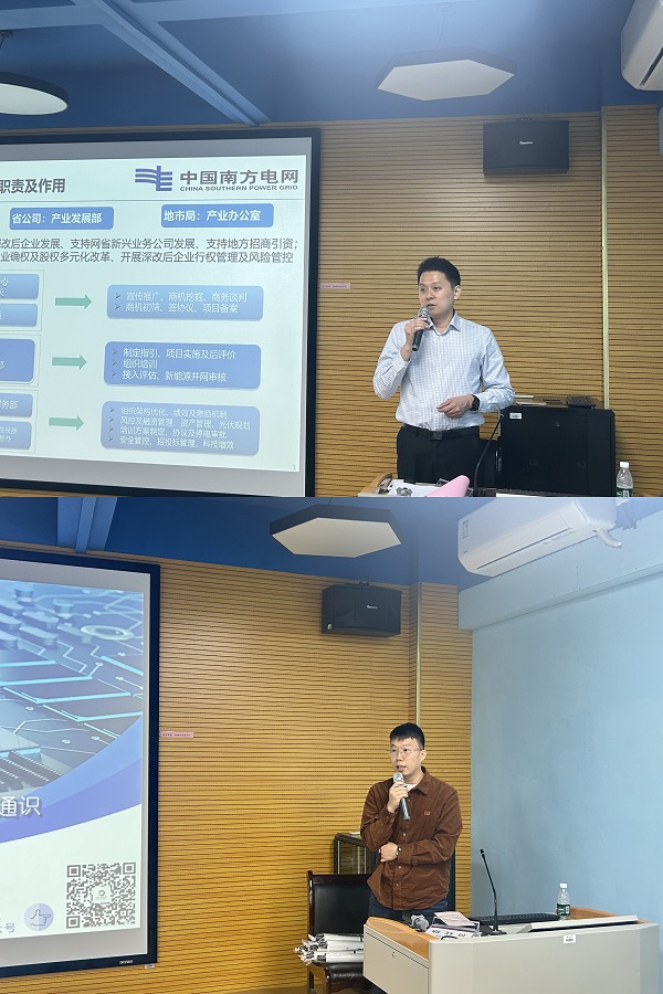 2008级校友宋海龙,目前担任广东电网公司肇庆供电局产业办公室副总经理。他以“战略性新兴产业与新质生产力,对未来人才培养、就业需求的启发”为主题,分析了南方电网、广东电网公司在战略性新兴产业发展方面的高质量发展布局。他强调,这些新兴产业不仅代表着经济发展的新方向,更孕育着巨大的就业潜力,对人才的需求也日益旺盛。同时,他也对学院的人才培养提出了宝贵建议,希望学院能够加强与新兴产业的对接,培养出更多适应市场需求的高素质人才。