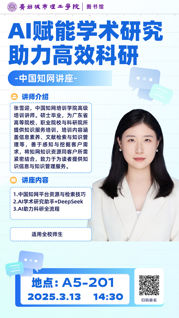 张雪迎,中国知网培训学院高级培训讲师。硕士毕业,为广东省高等院校、职业院校与科研院所提供知识服务培训,培训内容涵盖信息素养、文献检索与知识管理等,善于感知与挖掘客户需求,将知网知识资源同客户所需紧密结合,致力于为读者提供知识信息与知识管理服务。
