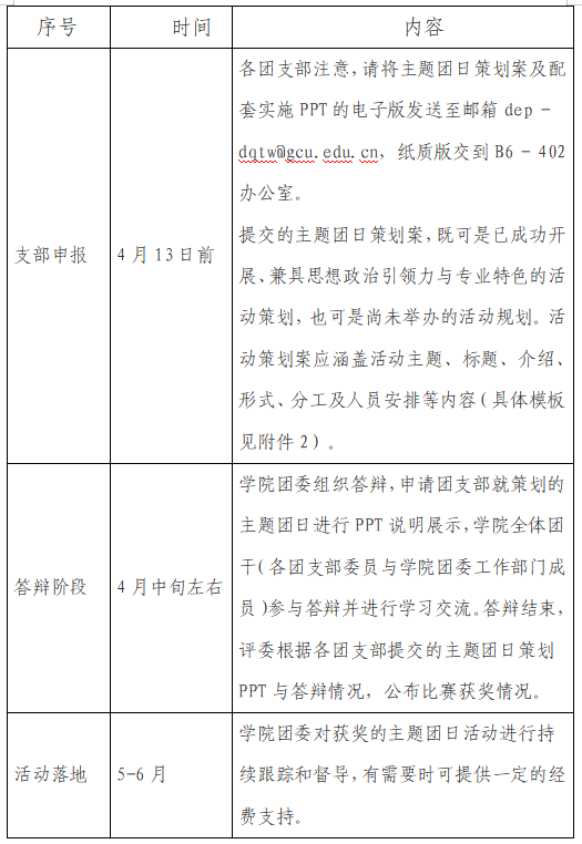 支部申报4月13日前各团支部注意,请将主题团日策划案及配套实施PPT的电子版发送至邮箱dep - dqtw@gcu.edu.cn,纸质版交到B6 - 402办公室。