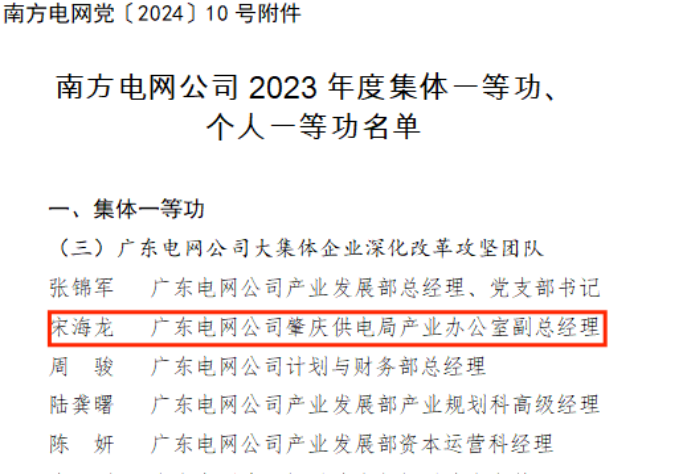 2022年,作为肇庆供电局产业办公室负责人,临危受命接下央企改革重任,仅用一年完成原定需三年的电网大集体企业确权及多元化改革的历史重任。广东电网属于全国首批开展此类改革的央企,无可借鉴的开展模式,面对压减法人、资产评估、央企确权和引进资方谈判等艰巨的改革任务和紧迫的时间要求,没有退路,只有迎难而上。宋海龙组织肇庆供电局人资、财务、企管等专业部门成立改革专班,细化攻坚计划从月到周再到日,积极开展多方“路演”,创新“线上+线下”引战谈判模式,“白+黑、5+2”压缩资产评估时间,最终实现肇庆供电局大集体企业成为全省首批前四家确权为央企并完成引战改革重任的单位之一。宋海龙也因此获得广东电网改革“先进个人”称号,所在的广东电网改革团队更是获得南方电网“集体一等功”最高荣誉。其本人也成为肇庆供电局唯一两次获得“南方电网集体一等功”的员工。