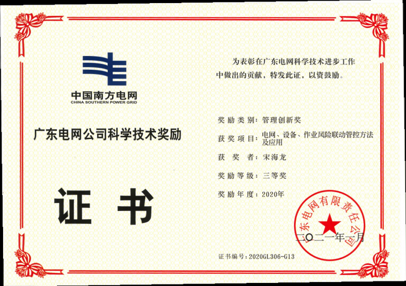 扎根生产一线成长,从肇庆供电局输电管理所见习生到高级作业员,他踏实肯干、兢兢业业,从“优秀新员工”“优秀技术能手”到“先进个人”,他一路成长、一路进步。2017年,宋海龙被广东电网公司选中在广东电网公司生产技术部和电科院监控指挥中心分别挂职工作一年。挂职锻炼期间,负责协助输电科开展全省机巡业务推广及管理和输电运维管理,完成机巡中心的筹备组建工作和牵头组织编写9份机巡作业业务指导书,多次参与公司生产管理及制度修编,其中参与编制的《电网、设备、作业风险联动管控方法及应用》获广东电网管理创新三等奖。