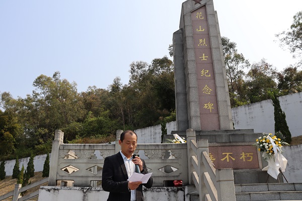 赵超军介绍了花山镇的革命历史和花山烈士陵园的建设情况。他说道,“在花山镇这片土地上涌现出许多仁人志士。他们英勇奋斗、前赴后继,用生命谱写了可歌可泣的壮丽诗篇,用血肉构筑了永垂不朽的历史丰碑。”他通过分享烈士黄树、黄梯两父子积极推进农运工作和为革命献身的英勇事迹,激发大家的爱国热情和奋斗精神。
