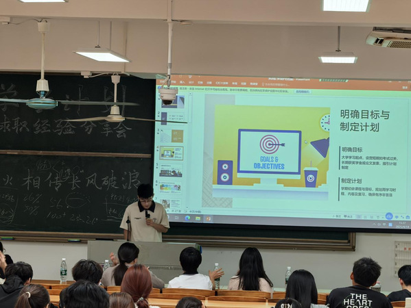 游帮坤,2021级电气工程及其自动化6班班长,在交流分享中介绍了班级同学的就业状况。他认为有些成绩并不突出的同学,凭借自身不懈努力,也能收获心仪的工作机会,鼓励大家树立求职信心。随后,游帮坤围绕南方电网的笔试、面试环节,分享了自己的求职历程。他绘声绘色地讲述面试南方电网时的具体情景,倾囊相授诸多实用的面试技巧。