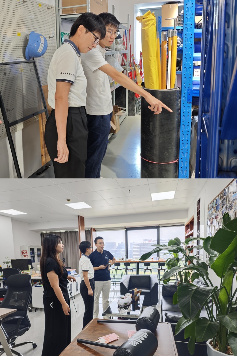 首先,符红勋一行来到广东睿哲电气科技有限公司。公司创始人2014届校友梁一鸣带领参观了公司办公室、物资室、会议室、休息区等区域。交流环节,梁一鸣介绍了公司的发展历程、业务范围以及人才招聘等方面的情况。双方围绕行业动态、人才培养、学生实习就业等话题展开深入探讨。
