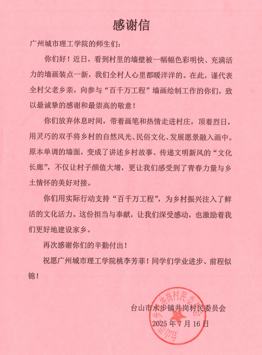 台山市水步镇井冈村民委员会的感谢信(林奕丹 供)