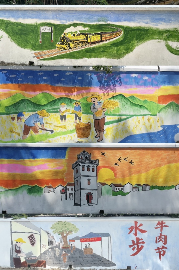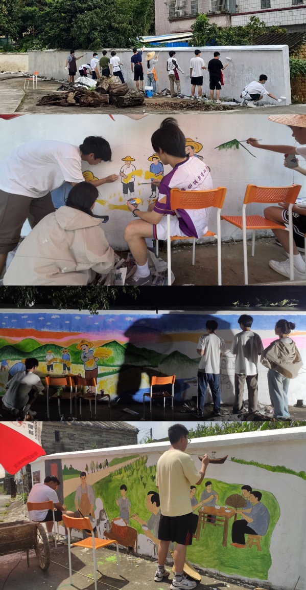 队员们顶着烈日,手持画笔和颜料,进行调色、填色和细节刻画。水步牛肉节、碉楼建筑、稻田风光……志愿队成员紧扣水步镇的地域特色和文化底蕴,将当地代表性元素融入创作中。历时6天,青耘志愿队完成4面墙绘创作,共10个主题,全长68.5米,总面积约为120平方米。完工之际,崭新的墙绘吸引附近村民驻足观看,并获得一致好评,村民们表示,这些画作充满了活力与美感,让村子面貌焕然一新。