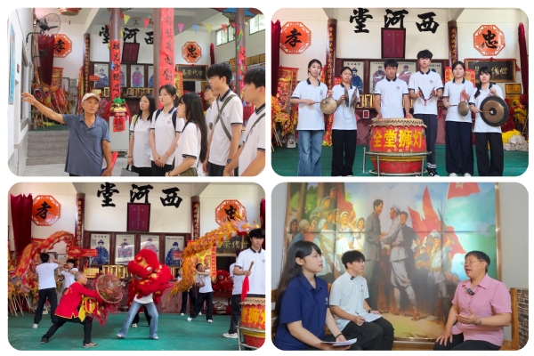 7月31日,实践团抵达东上乡林氏祠堂,拜访国家级非物质文化遗产全堂狮灯代表性传承人林文辉。在林文辉的带领与讲解下,成员们参观了祠堂内陈列的龙灯、狮灯道具、刀具、锣鼓等,近距离感受全堂狮灯的独特魅力。随后,团队成员宇文煜和韦婷婷对林文辉进行采访,为完善“小井”AI智能体知识库搜集资料。成员们还学习了全堂狮灯的历史,体验了其核心乐器的演奏,感受非遗文化与红色历史的交融。