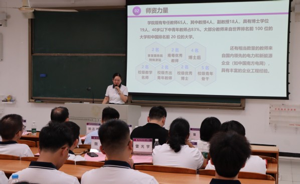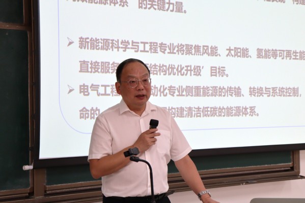 随后,杨向宇以《以青春之力 筑电力强国梦——与新时代能源变革同行》为题目,为电气学院新生讲授思政课。他解读了我国当前的能源战略,详细介绍了国家电力相关蓝皮书等政策,深层次分析了电力和新能源行业所面临的挑战与方向,勉励新生打基础、跟前沿、立大志,投身能源强国建设。